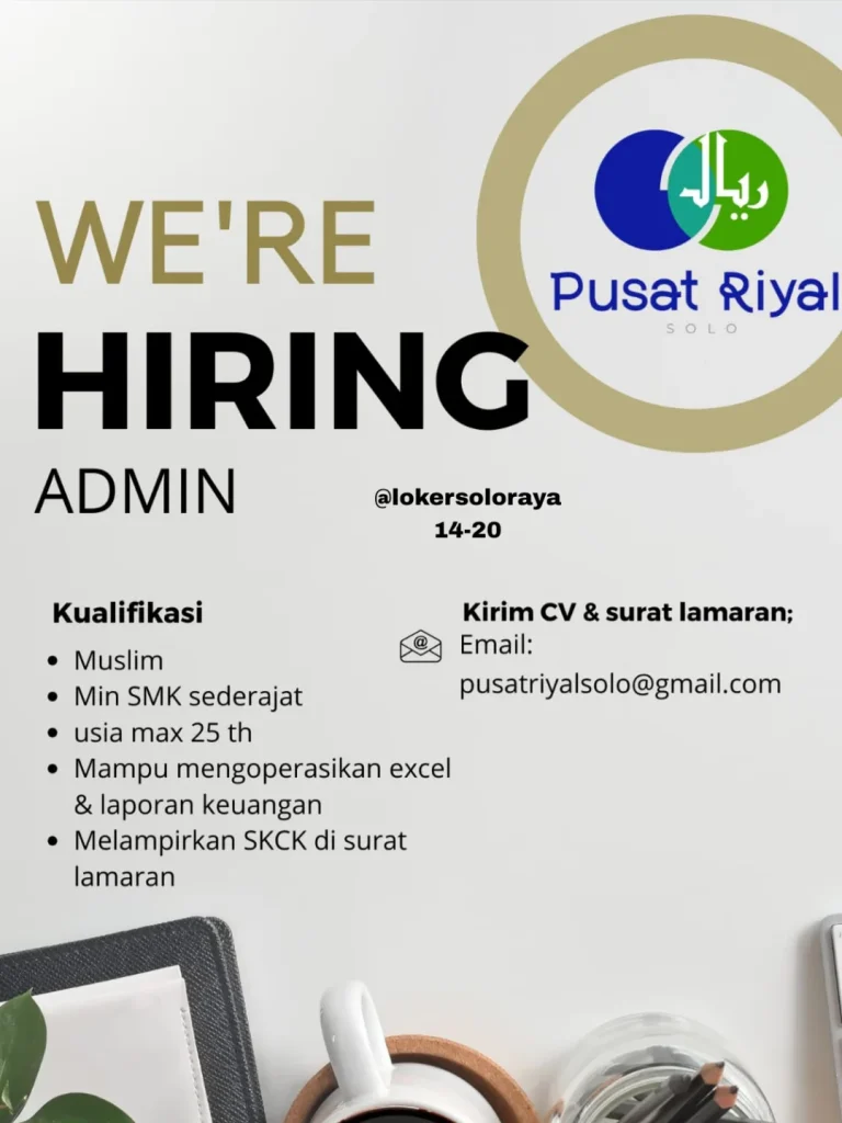 LOKER ADMIN – SOLO Bismillah, Dibutuhkan Admin! Kualifikasi: Muslim Minimal SMK Maksimal 25 tahun Mampu mengoperasikan Excel dan Laporan Keuangan Melampirkan SKCK di surat lamaran
