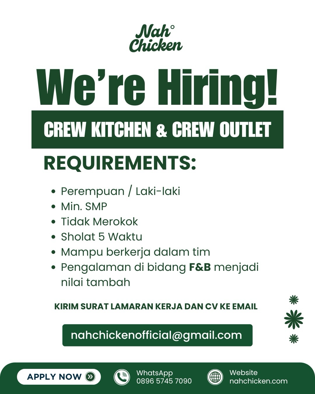 Kesempatan bergabung bersama Nah° Chicken kini terbuka untuk posisi: