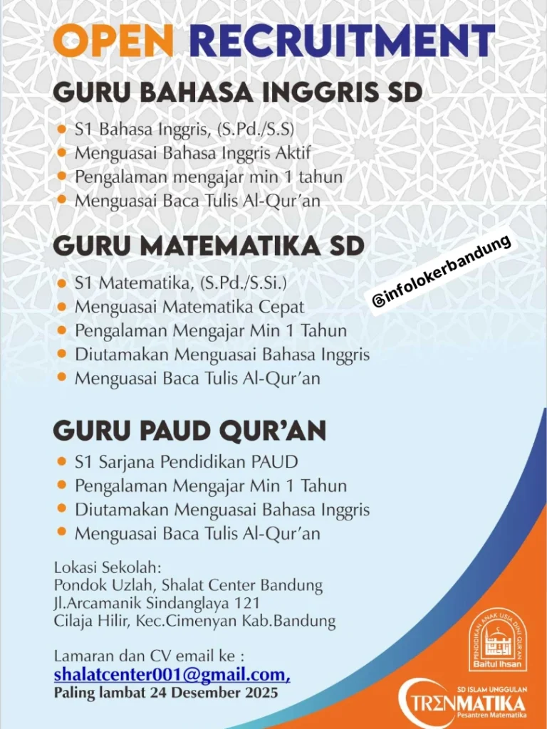 DIBUTUHKAN UNTUK POSISI: GURU PAUD QUR’AN, GURU MATEMATIKA SD & GURU BAHASA INGGRIS SD