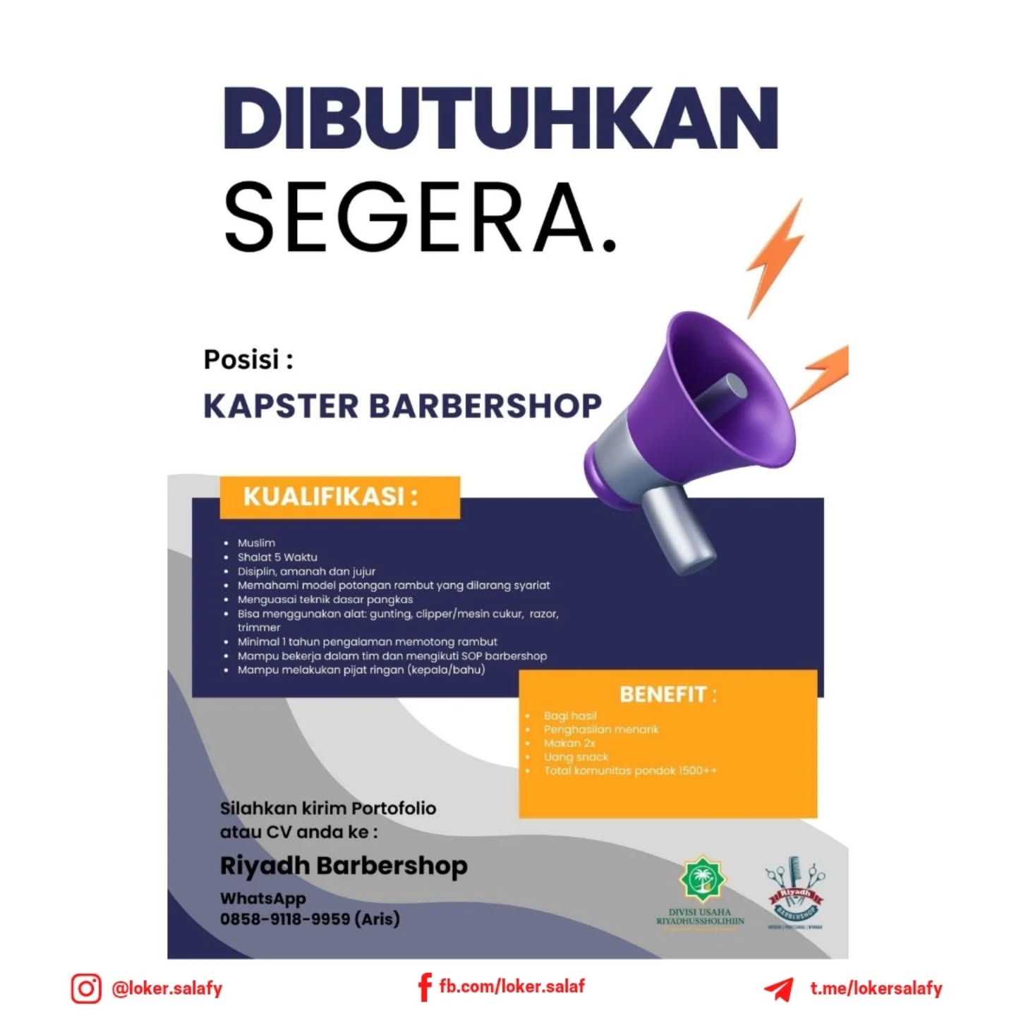 Kami (Riyadh Barbershop) Pondok Pesantren Riyadhussolihiin Pandeglang, dengan jumlah komunitas pondok yang besar 1.500++ terdiri dari santri, walisantri, asatidzah serta karyawan. Menjadikan kebutuhan di internal pondok akan pangkas rambut sangat besar setiap hari nya, tidak hanya untuk internal kami pun menerima dari luar masyarakat sekitar yang butuh layanan jasa pangkas rambut. Maka dari itu kami membuka kesempatan bagi para kapster barbershop untuk bermitra dan mendapatkan benefit yang sangat menarik.