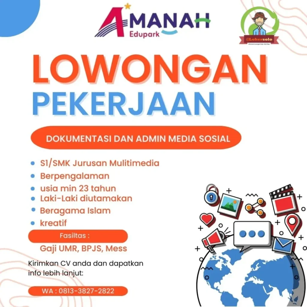 LOKER KRU MEDIA SOSIAL – KARANGANYAR Info lowongan kerja di AMANAH Edupark sebagai : DOKUMENTASI DAN ADMIN MEDIA SOSIAL Kualifikasi: S1/SMK Jurusan Multimedia Berpengalaman Usia minimal 23 tahun Beragama Islam Kreatif Kirim lamaran lengkap kamu ke:WA: 0813-3827-2822