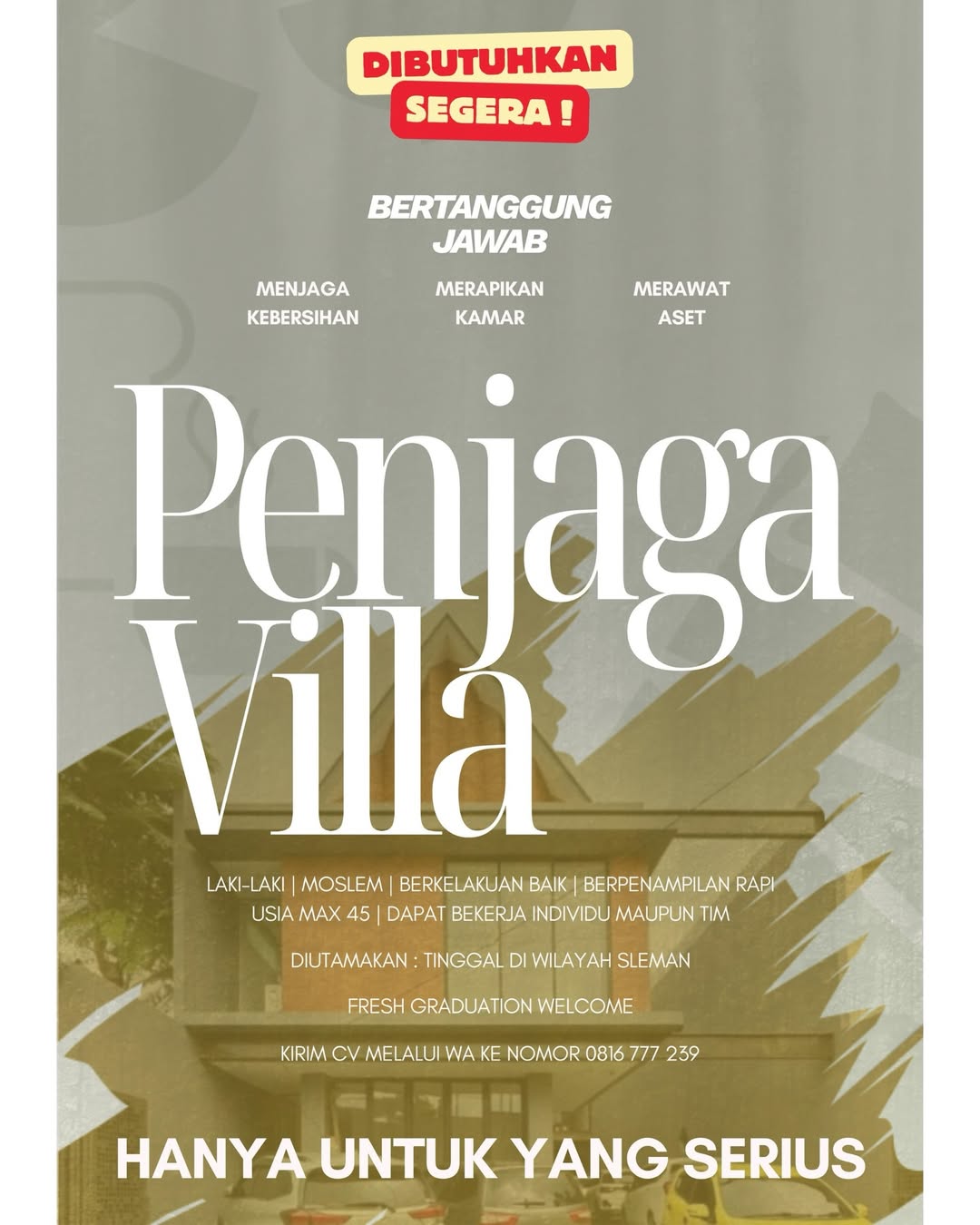 Kami membuka lowongan Penjaga Villa untuk Anda yang siap bekerja dengan penuh tanggung jawab.
