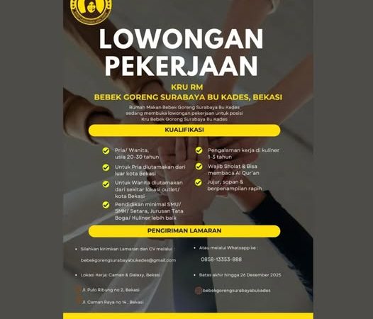 Bismillah.Rumah Makan Bebek Goreng Surabaya Bu Kades sedang membuka lowongan pekerjaan untuk posisi Kru. Kriteria : Pria/...